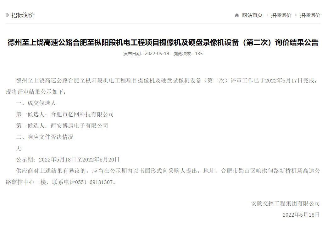 5月18日,再傳捷報,合肥市億網(wǎng)科技有限公司在眾多的競爭者中經(jīng)過公司各部門相關人員團結一致、齊心努力,憑借過硬的技術實力、良好的信譽和豐富的項目經(jīng)驗贏得了業(yè)主和評標委員會的肯定,我公司在競標中兩次擊敗競爭對手,最終中得安徽交控工程集團有限公司《德州至上饒高速公路合肥至樅陽段機電工程項目》。